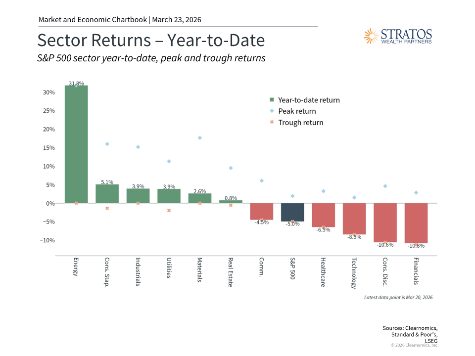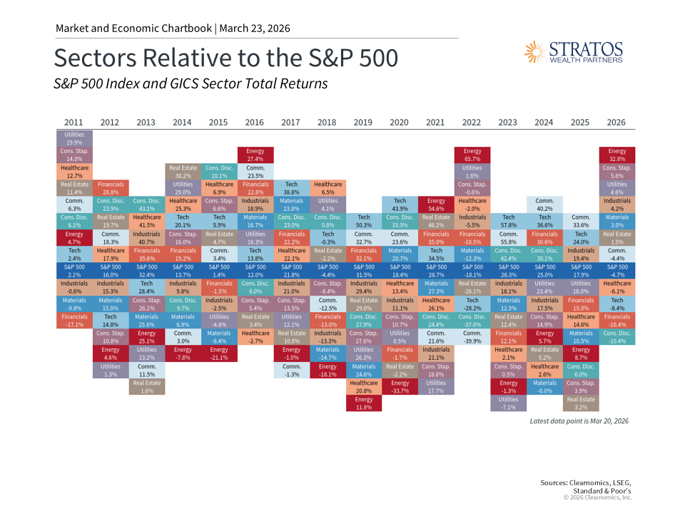 A well-diversified portfolio that includes cyclical sectors like energy, growth-oriented sectors like technology, and defensive sectors like utilities and consumer staples is better positioned to weather different market environments. Rather than trying to time sector rotations, which is just as counterproductive as timing the overall market, clients benefit from holding a balanced portfolio that can participate in gains across different parts of the economy while managing risk.